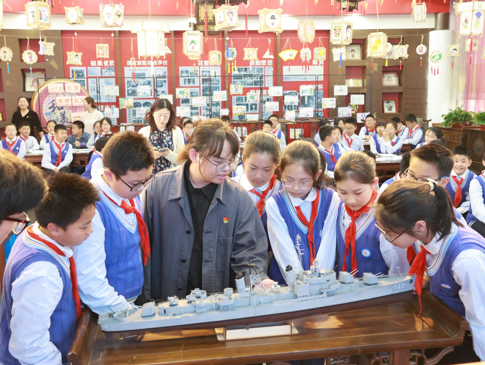 4月14日至19日,船海学院“蓝途”学生社区联合镇江市文化馆开展“沉浸式”红色教育周活动。军休老干部周群良讲述《人民空军起飞的故事》,带领青少年重温革命岁月;科技展区内,长征一号核潜艇模型、雪龙2号破冰技术动态演示等“国之重器”的科普讲解,让亲子家庭直观感受海洋科技的磅礴力量。活动以“红色教育+科技体验”模式,将国家安全与海洋强国理念深植青少年心田,为“船承思政”品牌注入新动能。