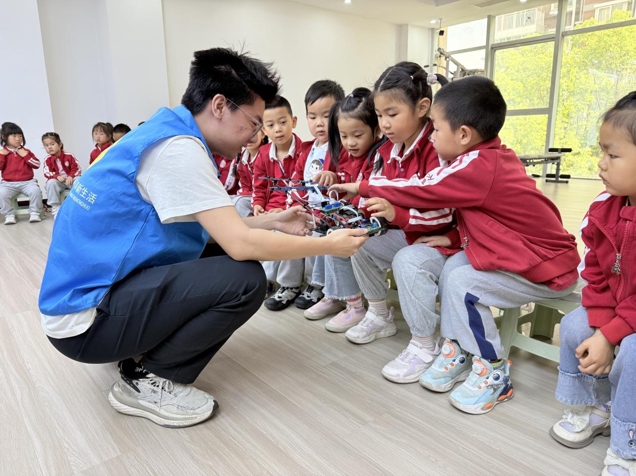 在武将幼儿园科技启蒙课堂,"自信"一站式学生社区党员领航员化身"科技讲师",通过"理论讲解+实物演示+沉浸体验"三维教学模式,为30余名幼儿开启科技探索之旅。领航员高源用生动的比喻向小朋友们讲解了电磁小车的基本原理,通过演示电流如何在线圈中产生磁场,让小朋友们直观感受吸引与排斥的力量孩子们瞪大双眼发出阵阵惊叹。